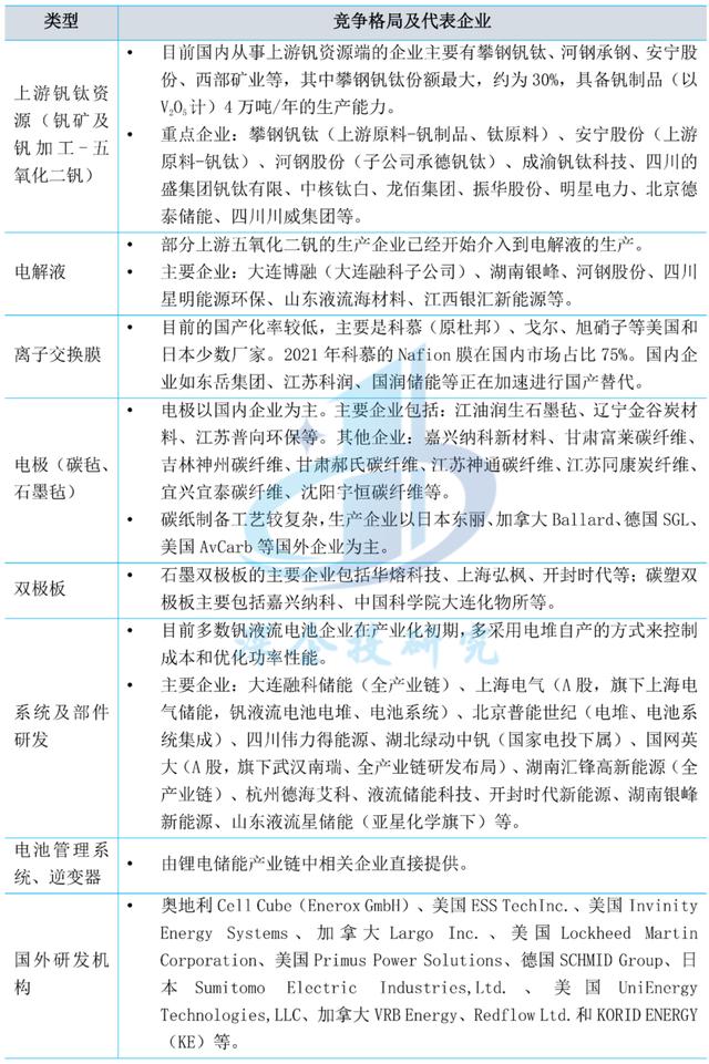 當前國內全釩液流電池市場總體體量較小,龍頭格局未顯,產(chǎn)業(yè)仍處于發(fā)展初期。產(chǎn)業(yè)鏈各環(huán)節(jié)的競爭格局和代表企業(yè)如下表所示。