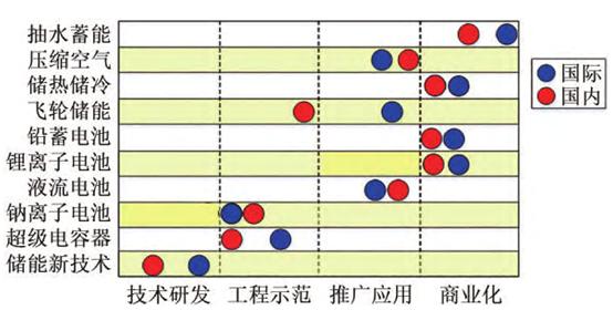 從各類儲能技術的研發(fā)推廣進程看,目前我國儲能技術基本上與國際先進水平并跑,壓縮空氣儲能、儲熱儲冷、鉛蓄電池、鋰離子電池、液流電池和鈉離子電池技術已達到或接近世界先進水平;抽水蓄能、飛輪儲能、超級電容和儲能新技術與世界先進水平還有一定的差距,如下圖所示。