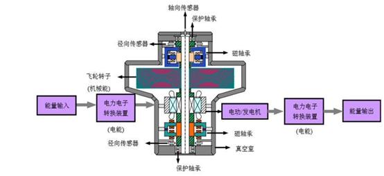 ——工作原理。飛輪儲能的原理是利用過剩電力給真空外殼中的轉子(飛輪)加速,把電能以動能的形式儲存。在儲能階段,通過電動機拖動飛輪,使飛輪本體加速到一定的轉速,將電能轉化為動能;在能量釋放階段,飛輪的旋轉速度會降低,電動機作發(fā)電機運行,將動能轉化為電能。一般來說,飛輪系統(tǒng)使用電流來控制飛輪速度,其中高能的飛輪使用高強度碳纖維制成的轉子,并通過磁懸浮軸承實現(xiàn)懸浮。這些轉子在真空罩內的轉速可達到20000-50000rpm,可以在幾分鐘內達到所需的速度。