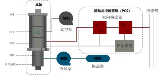 產(chǎn)業(yè)鏈上游。典型的飛輪儲能系統(tǒng)基本結構包括5個部件:1)飛輪本體,一般為高強度復合纖維材料(如碳纖維復合材料)制成;2)軸承,為轉子提供低耗損支撐,利用非接觸式的永磁軸承、電磁軸承或超導懸浮軸承等支承飛輪;3)電機,一般為電動/發(fā)電互逆式雙向電機(電動機+發(fā)電機);4)電力轉換器,是輸入電能轉化為直流電供給電機,輸出電能進行調頻、整流后供給負載的關鍵部件;5)真空器(真空室),為減少空氣阻力,飛輪系統(tǒng)放置于高真空密封套筒內。上游部件主要由華陽股份、國機重裝、湘電股份、廣大特材等企業(yè)提供。產(chǎn)業(yè)鏈中游為飛輪儲能系統(tǒng)集成,主要設備廠商也同時參與。下游為發(fā)電側、電網(wǎng)測的業(yè)主單位。