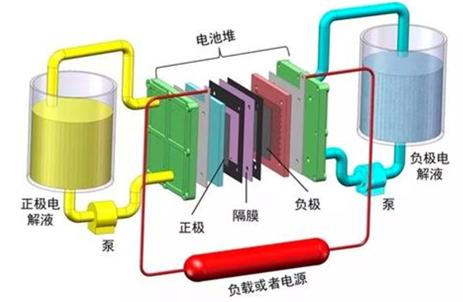 ——工作原理。液流電池通過離子選擇膜的離子交換將化學能轉化為電能,離子選擇膜將兩種液體電解質分開存儲在不同的罐中,利用兩種化學溶液進行離子交換來進行充放電,其電壓一般在1.0-2.2V之間。與其它電池相似,液流電池的功率與隔膜面積成正比,而儲存能量的多寡和溶液儲存容量成正比。