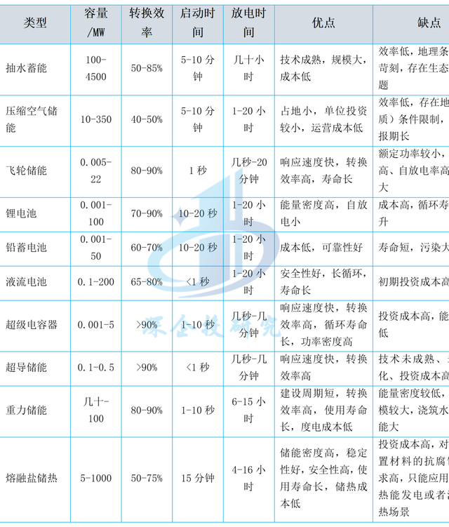 儲能技術呈現(xiàn)多元化發(fā)展格局,各有不同的應用場景。每種儲能技術均具有一定的獨特性,在實際應用中,需要用戶綜合考慮各種儲能技術的特點以及優(yōu)缺點,選擇最適宜的技術方案。比如,飛輪儲能、超級電容、超導儲能可以解決秒級或分鐘級以下的調頻需求;抽水蓄能、壓縮空氣儲能、燃料電池和電化學儲能等則更適用于進行小時級調峰;氫儲能適合執(zhí)行季節(jié)性調峰。不同儲能技術的特點如下表所示。