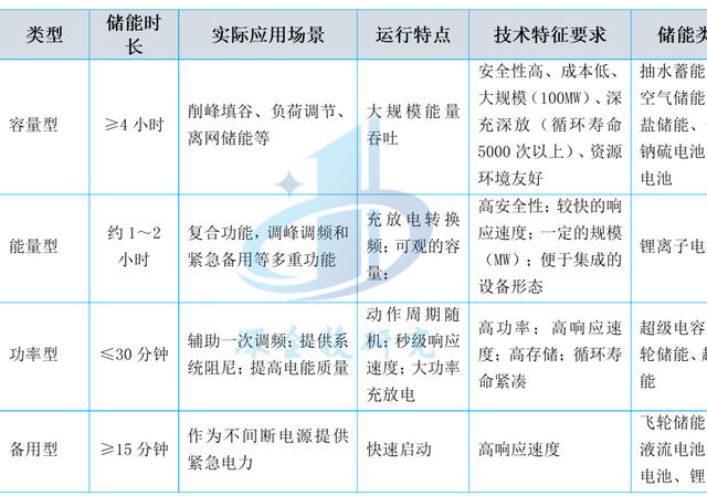 按照時長要求的不同,儲能的應用場景可分為容量型(≥4小時)、能量型(約1~2小時)、功率型(≤30分鐘)和備用型(≥15分鐘)四類,對應的應用場景如下表所示。