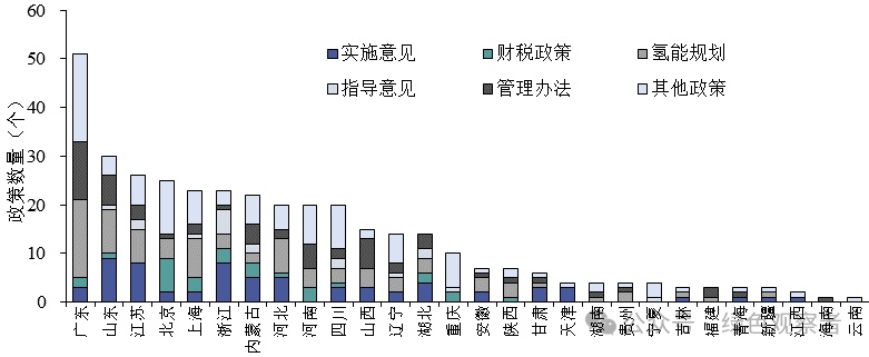圖3 中國各省市氫能產(chǎn)業(yè)各領(lǐng)域政策分布資料來源:根據(jù)氫能產(chǎn)業(yè)大數(shù)據(jù)平臺(tái)檢索所得(檢索時(shí)間2023年9月14)。