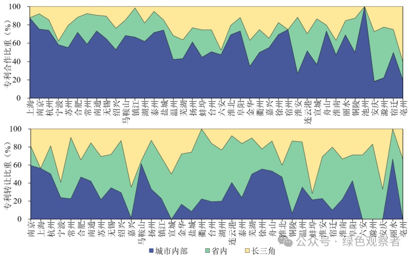 圖4 長三角不同空間尺度的氫能專利合作及專利轉(zhuǎn)讓占比資料來源:根據(jù)incopat專利數(shù)據(jù)庫進(jìn)行專利檢索所得。注:部分城市未發(fā)生氫能專利合作及專利轉(zhuǎn)讓事件,故數(shù)據(jù)為零或未體現(xiàn)。