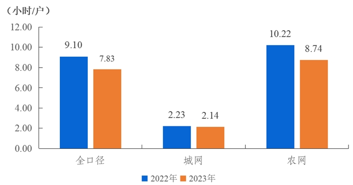 全國用戶平均停電時(shí)間7.83小時(shí)/戶,同比減少1.27小時(shí)/戶,其中城網(wǎng)2.14小時(shí)/戶,農(nóng)網(wǎng)8.74小時(shí)/戶。城網(wǎng)與農(nóng)網(wǎng)相差6.60小時(shí)/戶。